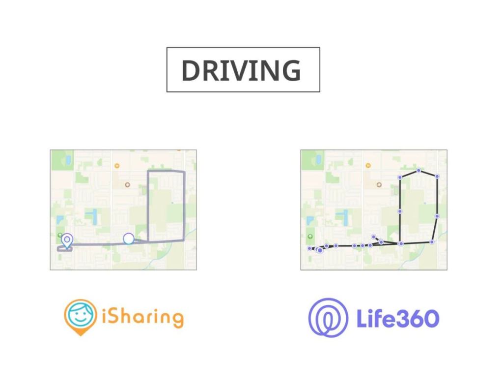 在从邻近社区出发的阶段,我注意到「爱分享」能准确地描绘出我的细微移动路径;而「Life360」看起来则像在过程中有稍微中断几次追踪 (大都是我在转弯时)。这个现象在我绕着街区转一圈时更为明显,就如上方右边的截图所示。 「Life360」的定位功能似乎经常会在我转弯时跳过不追踪,而结果就是忽略了我实际有开过路段。所幸我仍可以从画面上看出开过的路径,但我推测如果是开到一些难度更高的路况时、可能就更难从「Life360」上看出实际经过的路径了 (例如经过许多弯道时)。