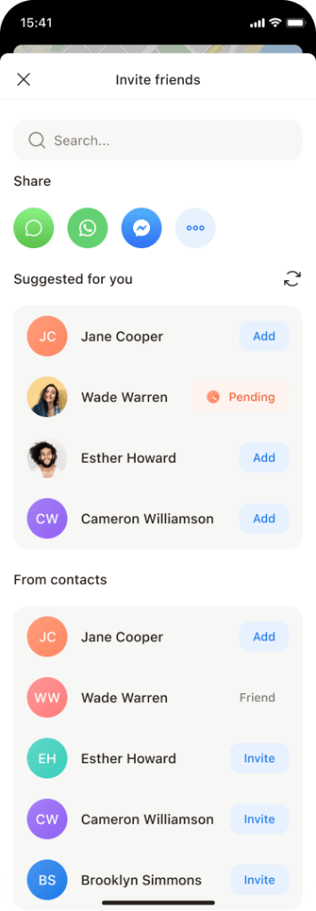 • 넘어간 친구 추가 화면에서 연락처에서 추가하거나 카카오톡 등의 메신저를 이용해 친구에게 친구 추가 요청을 보내시면 됩니다.